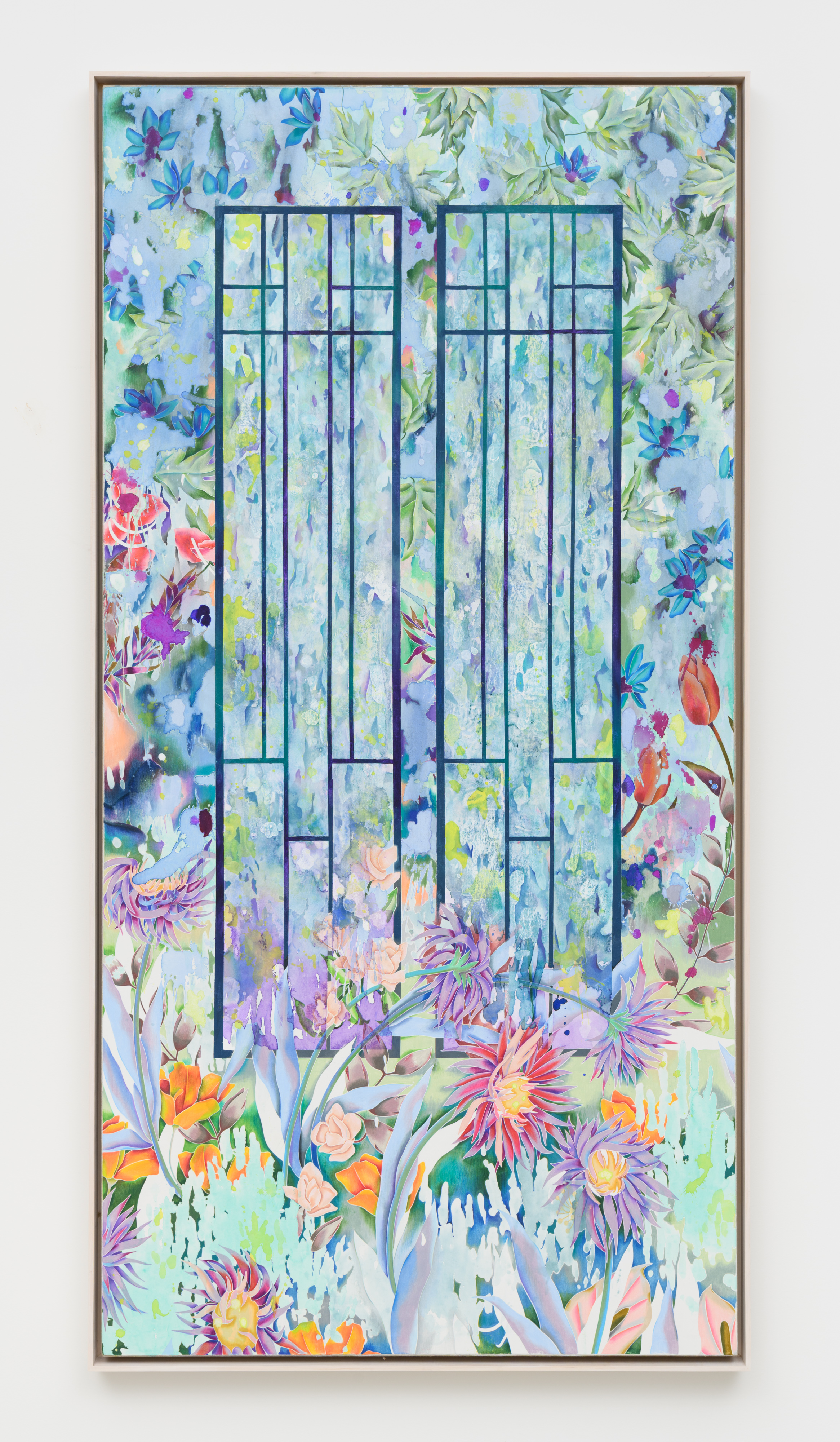 "I dwell within my heart as if inside a hollow tree," 2025. Watercolor and colored pencil on prepared linen over panel, framed. 74 IN x 38 IN