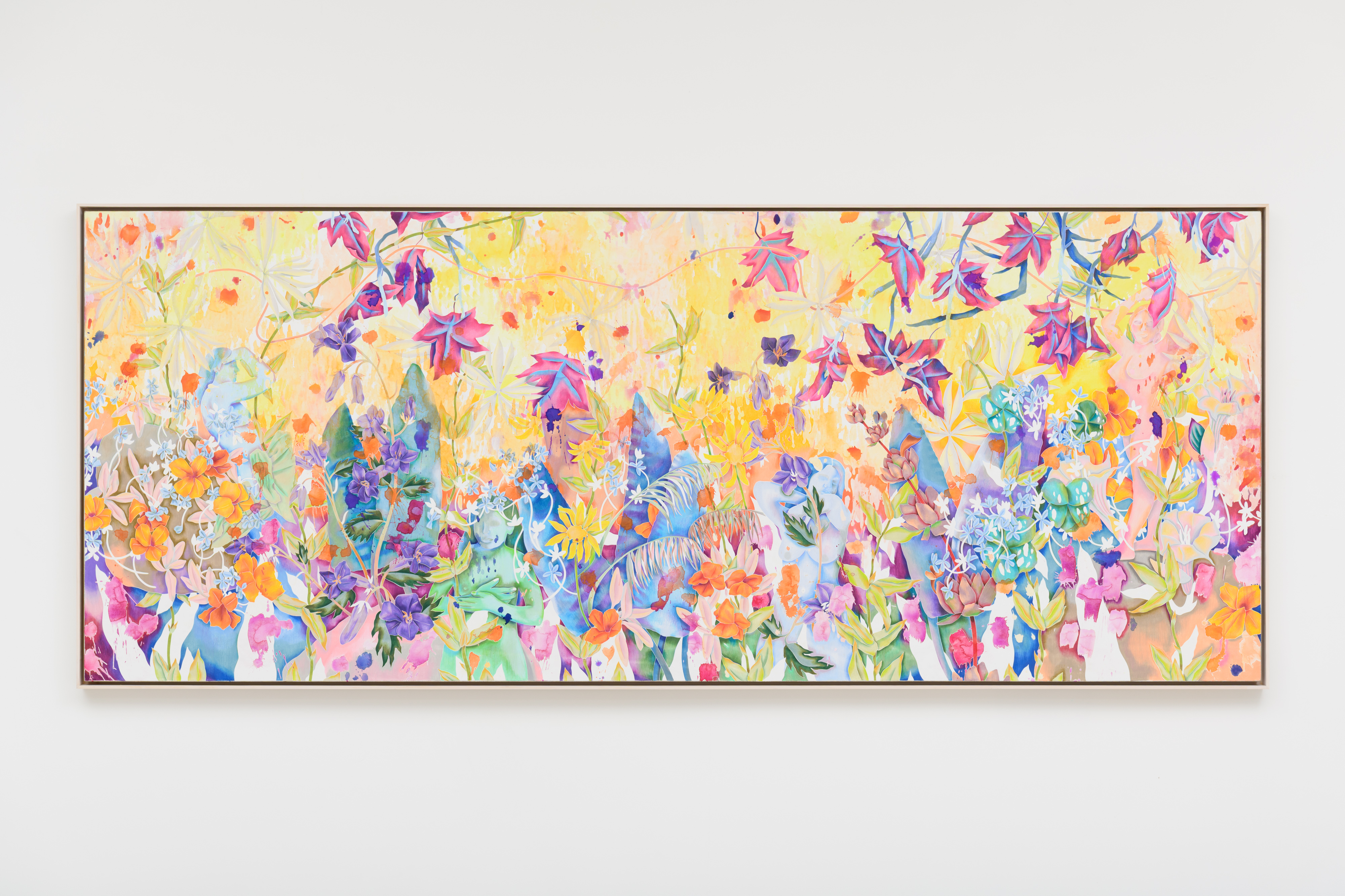 "More windswept, more grateful," 2025. Watercolor and colored pencil on prepared linen over panel, framed. 50 x 122 IN