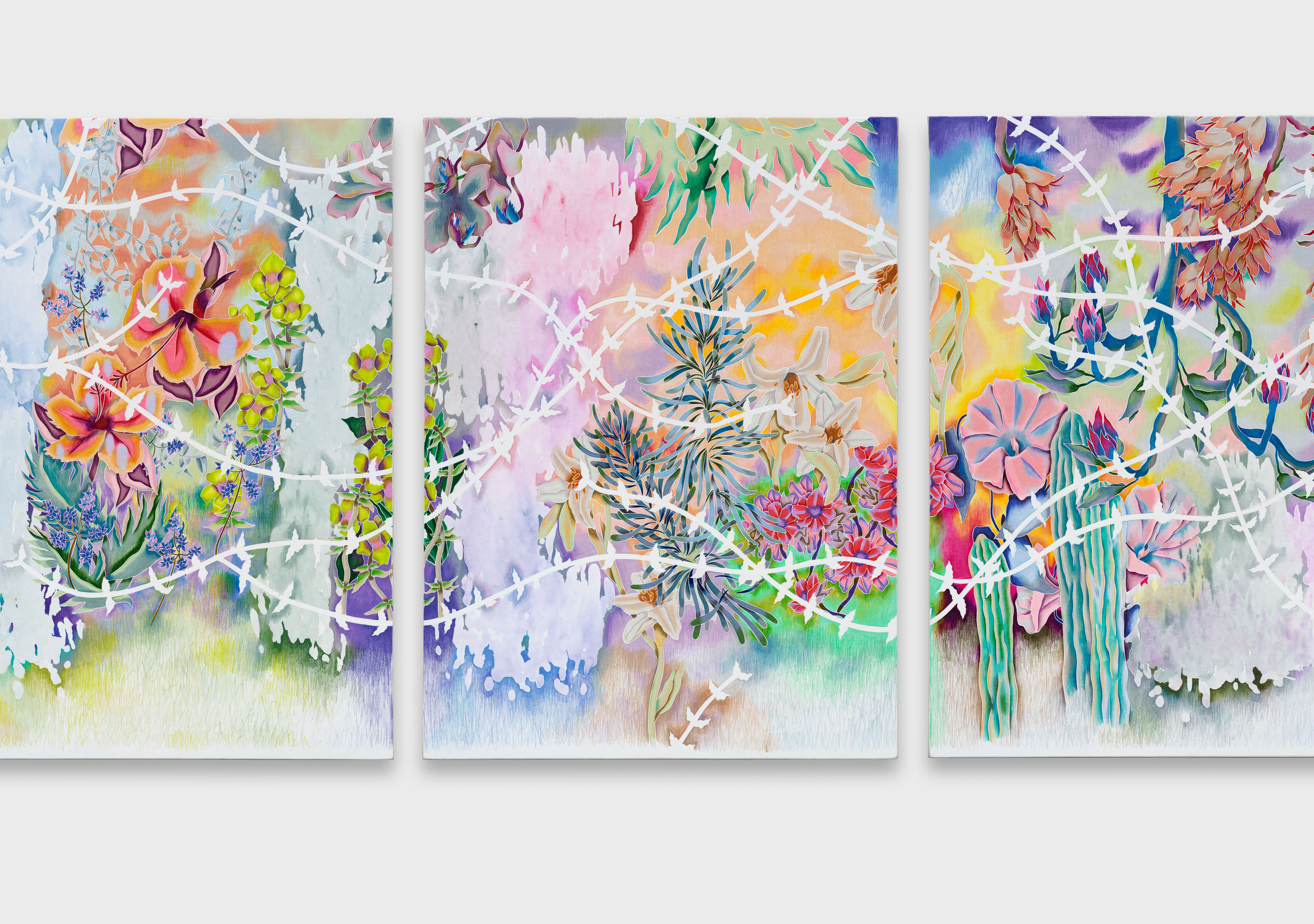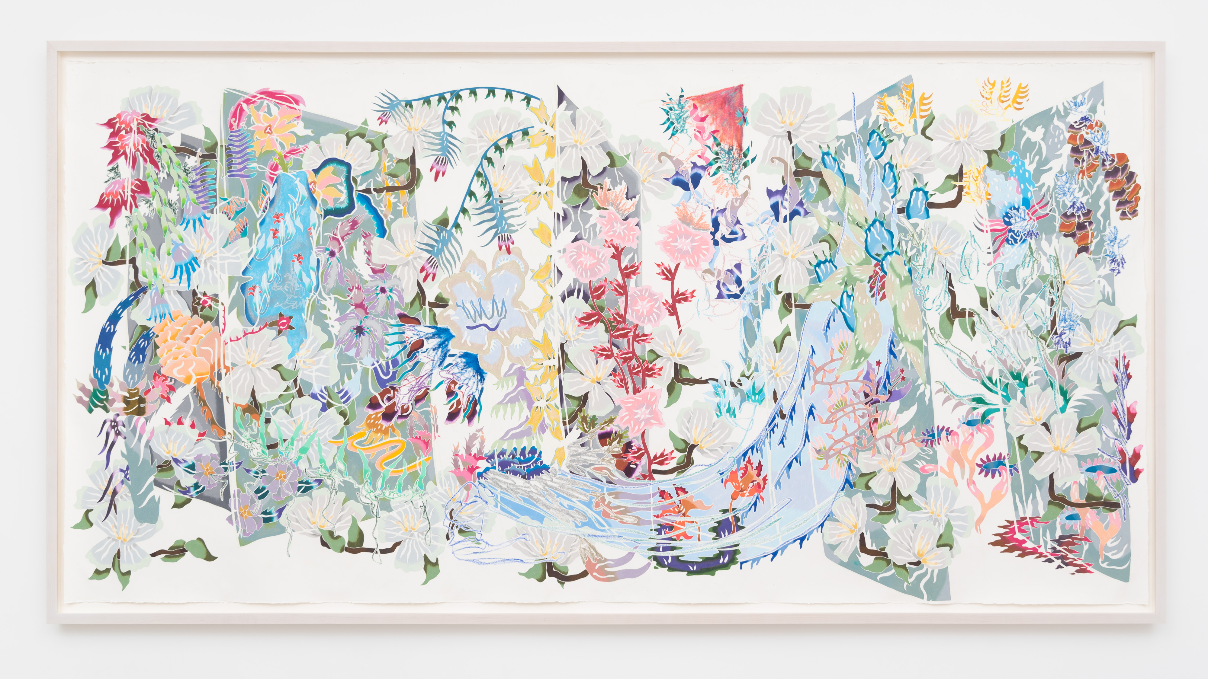"Gem Magnolias," 2021. Oil pastel and colored pencil on paper, framed. 55 x 106 IN